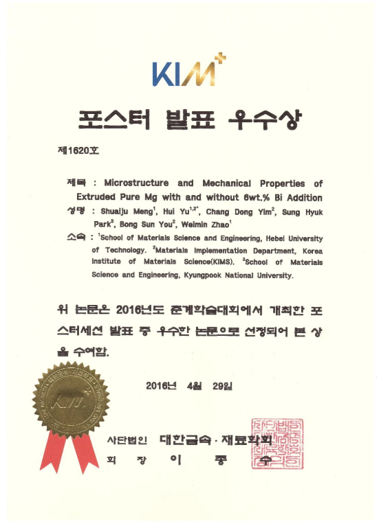 2016.04.29 대한금속재료학회 포스터 발표 우수상